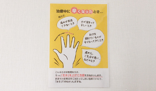ざいもくちょう歯科では、皆さんにできるだけ苦しくなく治療を受けていただけるよう、当医院では治療中でも「何かあればいつでも治療を止められる」ようご説明しています。