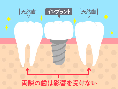 インプラントは歯を失った部分に独立して歯をたてることができるので、周囲の歯にダメージを与えません。それに対し、歯を補う他の治療法である入れ歯やブリッジでは、単独で装置を入れることができず、周囲の歯に金具をかけて力の負担がかかりすぎてしまったり、周囲の歯を大きく削らなければならない、というようなデメリットがあります。